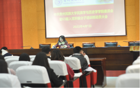 动员大会正式开始后。首先,何老师介绍了本期入党积极分子培训班的基本情况,鼓励各专业和各年级同学之间多相互沟通、交流学习,向学员们说明了班级日常管理服务工作要求,强调学员们要配合指导老师、小组长以及联络员的工作安排和按时执行相关规定。