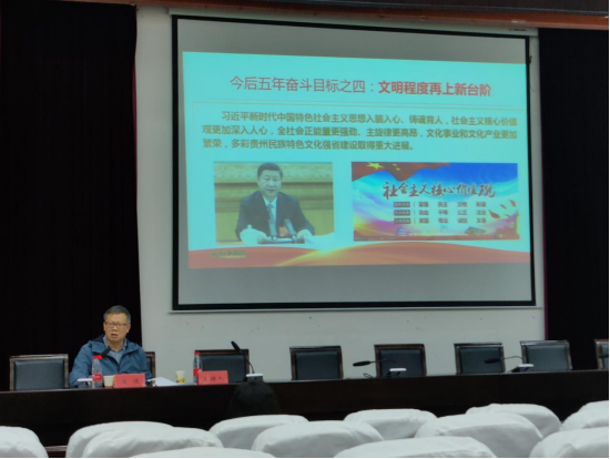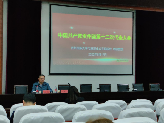 为深入学习贯彻落实中国共产党贵州省第十三次代表大会精神。williamhill官网马克思主义公司、williamhill官网、社会公司、音乐舞蹈公司各支部党员于2022年5月17日晚上19:30在15栋教学楼圆形会议室开展2022年上半年党员培训班第三次党课学习。本次会议由马克思主义公司经理周俊同志进行授课,授课内容为学习贵州省第十三次党代会精神。