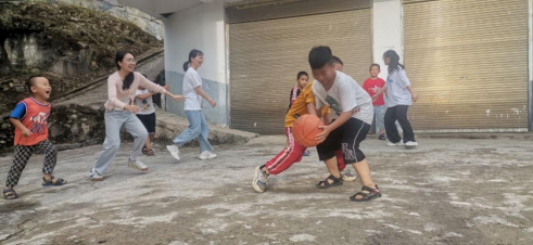 下午17点,召集小孩到村里空地一起玩游戏。双语志愿服务队开展篮球活动、扔沙包、乘法口诀抢答、少先队知识抢答等游戏,分别用汉语和苗语为孩子们讲解相关的注意事项和游戏内容,同时还教年纪较小的孩子们用汉字写自己的名字,用民汉双语给孩子们讲解男女厕所的区别,讲解日常生活中相关的礼貌用语。