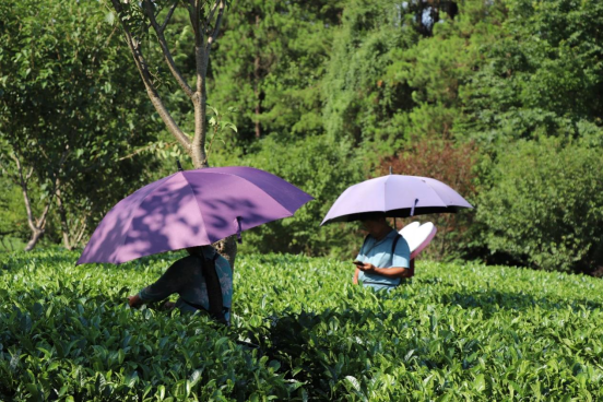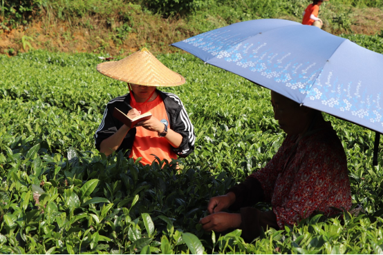 座谈结束后,团队前往茶基地参观并与正在采茶的农户进行访谈。大家向农户学习如何采茶,并请教制做干茶的技术。团队了解到一名茶农一天可以采三四斤茶青,收入大概在六七十左右,采茶的大多是女工,而家里的男主人则大多外出务工,所以整个家庭的收入加起来也算一个小康家庭了,这足以见得国家乡村振兴政策的成功。