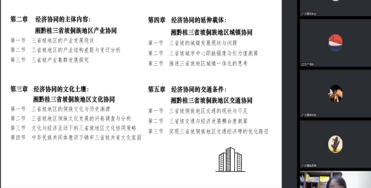 申雯清博士从湘黔桂三省坡经济协同发展的必要性与可行性、湘黔桂三省坡侗族地区产业协同、湘黔桂三省坡侗族地区文化协同、湘黔桂三省坡侗族地区城镇协同、湘黔桂三省坡侗族地区交通协同和湘黔桂三省坡侗族地区协同的战略市局等六个章节进行了详细阐述。申雯清博士讲解了当地协同发展所存在的制约因素,同时用具体实例和真实的数据对当地的发展进行了剖析,针对湘桂黔三省坡协同发展提出了七个政策建议: