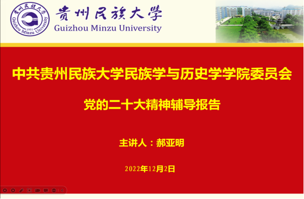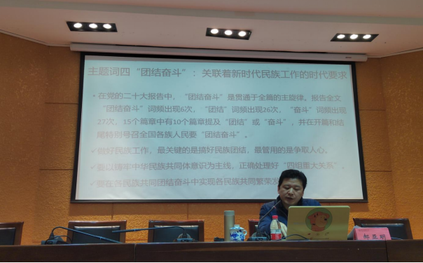 郝亚明教分别从主题词一“关键时刻”:关联着新时代民族工作的历史方位、关键词二“中心任务”:关联着新时代民族工作的使命担当、主题词三“国家安全”:关联着新时代民族工作的基础功能、主题词四“团结奋斗”:关联着新时代民族工作的时代要求、主题词五“党的领导”:关联着新时代民族工作的政治保证等五个方面宣讲了党的二十大报告的主要精神。