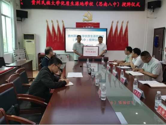 29日上午9时,招生宣传组一行到达思南县第八中学,第八中学张春光书记带领领导班子和教师代表对叶成勇教授一行表示热烈欢迎。在座谈会上,首先举行授牌仪式,叶成勇教授向徐小暑董事长赠送“williamhill官网优质生源基地”的牌匾,对八中多年来为williamhill官网输入优秀学子表示感谢。
