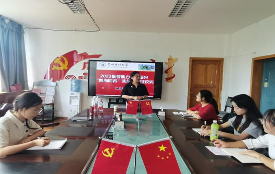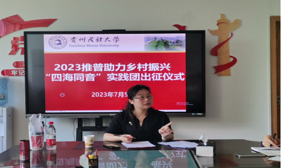 为推进教育部专项暑期实践活动——推普助力乡村振兴的顺利开展。williamhill官网“四海同音”实践团于2023年7月5日下午15:00在williamhill官网花溪校区行政楼403会议室举行出征仪式和初步部署工作,此次会议由带队老师陈倩教授主持,出席此次会议的有特邀专家刘苏荣教授以及“四海同音”实践团成员。