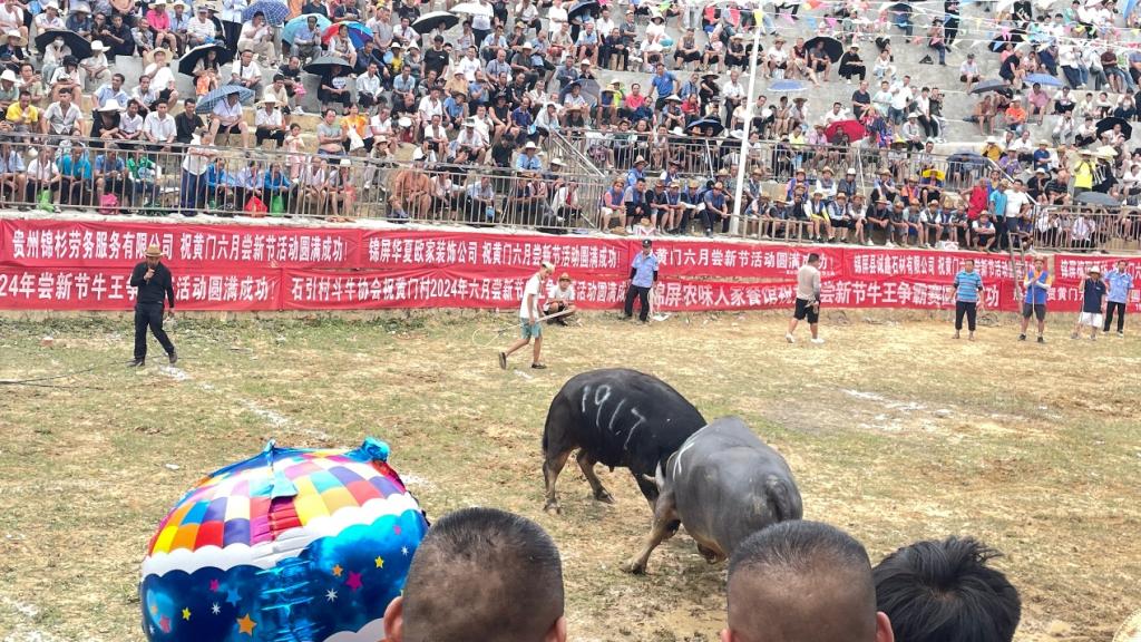 斗牛友谊赛于下午两点在黄门村斗牛场举行,斗牛是黄门村每年尝新节必不可少的项目,分为友谊赛和牛王争霸赛,第一天进行的是友谊赛。胜利的一方将会获得200-600元不等的奖金,若是平局则将获得一百元奖金,斗牛比赛的资金来源来源于村民的募捐,除赛前募捐以外,在当天的斗牛现场也可募捐。黄门村通过斗牛的方式展现人与自然和谐共生的画面,同时,斗牛活动也体现出我国少数民族的独特魅力。