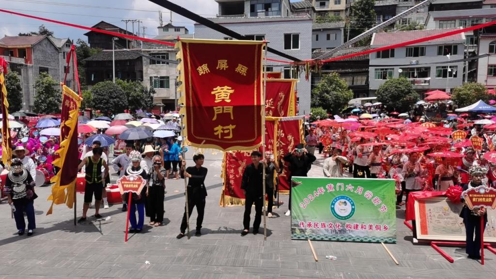 开幕式在村里的广场举行,每个村组建队伍参加,由该村的一名男士举写有自己村名的旗帜入场,女士都着自己民族的盛装,红黄蓝绿不尽相同,各有特色,每个村队伍的最前面都有一位姑娘举着写有村名的牌子作为领队。除彦洞乡各村寨参与外,还有来自剑河,贵阳等的队伍来参加。在队伍巡游结束回到广场后还进行了扁桶围塘表演,即在广场中央放扁桶数只,在上面摆放腌鱼、水果、蔬菜等,各村代表围坐在扁桶前,随后寨老领着一小孩进入扁桶圈中的大木桶前,一边用侗语念词,一边咀嚼木桶上的大葱,后离场。最后在主持人的一声声致辞中黄门村2024年吃新节拉开了帷幕。