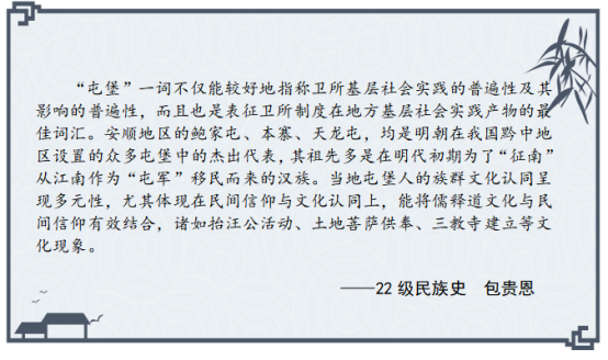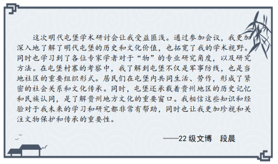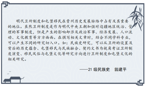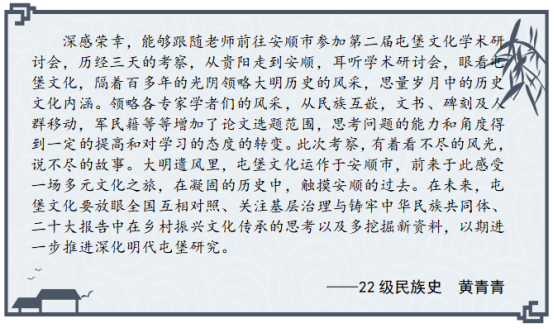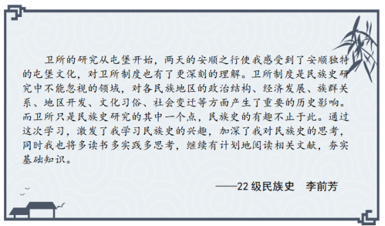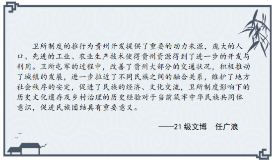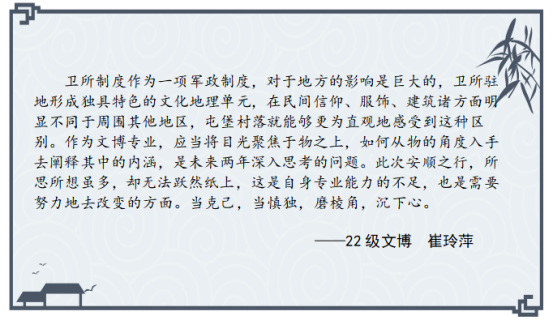 此次安顺屯堡文化学术研讨会是公司开展“学与思”系列研学活动的重要尝试,参会的硕士研究生在理论学习与实地考察中受益匪浅,感悟颇多,激发了他们对卫所制度的兴趣,有助于提升专业素养,扩大学术视野,促进论文选题。以下是参会硕士研究生的思考摘录。