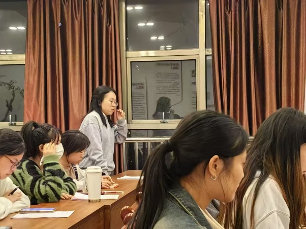 本科生同学们发言结束后就是研究生学姐们的见解。首先袁天美学姐分享了自己的阅读方法和阅读感悟,讲到了一些关于这篇文章的解读,并对同学们学习这个专业的兴趣问题提了一些建议。她建议我们不要因为他人的影响而打消对自己专业的信念,然后讲到自己的文章阅读顺序是从题目到结构再到主题,常常是对文章产生疑问然后去了解它。就比如她认为“重瓣花朵理论”非常贴切,但其实自己在看这篇文章之前并没有太多了解,也是去查阅了其他的一些资料,然后了解到中原文化也就是今天的渭河流域为什么是花心的原因。冯子睿学姐则是从中国史前文化的统一性和多样性两个角度来讲,然后联系贵州的实际解释了统一性和多样性的体现。