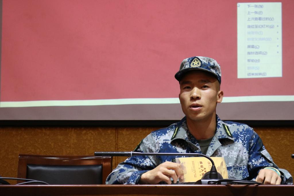 潘年涛同学就“逃兵”问题谈到他所在的部队有一名新兵因翻墙逃跑误踩地雷而不幸炸断双腿,接着也是以服役生涯为开头,讲述了队伍里生活和日常训练情况。他着重讲到大家最关心的老员工何时入伍的问题,用自己的经历真情实感的道出了在大四毕业入伍的好处,不仅是解决了一些经济问题,更多的是自我发展与自我成长。